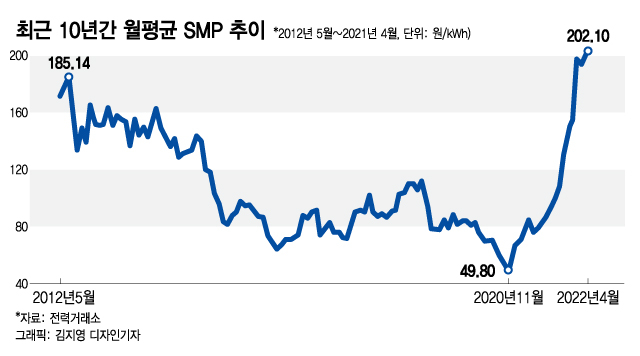전력통계정보시스템에 따르면 지난해 평균 1 ㎾h(키로와트시) 당 94.34원이던 SMP가 올해 1월 154.42원으로 오르더니 4월에는 202.11원까지 치솟았다. 1년사이 2배 이상 폭증한 가격에 민간발전사의 영업이익도 급증했다. 1분기에만 7조8000억원의 영업 적자를 낸 한전과 달리 GS EPS, 파주에너지 등 주요 발전사는 1분기 영업이익이 전년도 전체 이익을 뛰어넘었다.