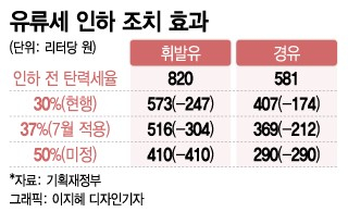 전날 배준영 국민의힘 의원은 유류세 법정 최대 인하폭을 현행 30%에서 50%로 확대하는 내용의 '교통·에너지·환경세법', '개별소비세법' 등 개정안을 발의했다. 국회의원 의석수 과반을 확보한 야당도 같은 수준의 유류세 인하폭 확대를 주장하고 있어 현실화될 가능성이 높다.