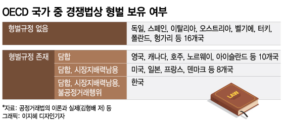 경쟁법상 형벌규정이 아예 없는 독일, 스페인, 이탈리아, 벨기에 등 주요 유럽 선진국들과 달리 우리나라 공정거래법에는 다수의 형벌이 담겨 있다. 일례로 △시장지배력 남용 △담합 △사업자단체 금지행위 △보복조치 △조사방해 등은 상대적으로 중대한 법 위반 행위로 보고 '3년 이하의 징역 또는 2억원 이하의 벌금'에 처하도록 하고 있다. 이 경우 징역형과 벌금을 동시에 부과할 수도 있도록 했다.