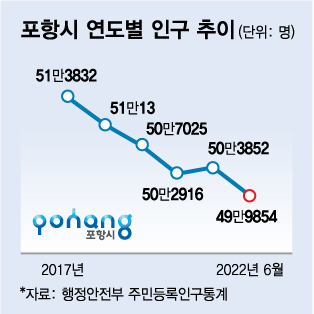 8일 행정안전부 주민등록인구통계에 따르면 지난달 포항시 인구는 49만9854명을 기록했다. 포항시는 인구 50만명을 유지하기 위해 지난해 인구정책 기본 조례를 만들고, 주소를 이전한 주민들에게 정착지원금을 지급하는 등 50억원에 가까운 예산을 투입했지만 끝내 인구감소 추세를 막진 못했다.