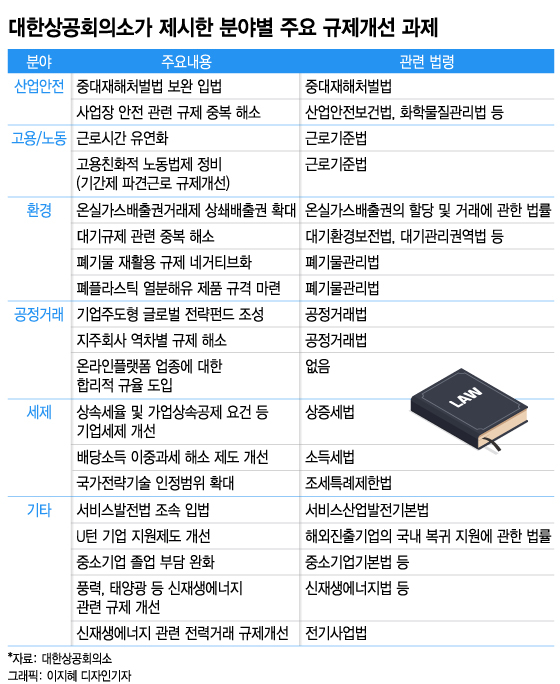 경제계는 경쟁당국의 과도한 규제도 완화할 것을 요구하고 있다. 대기업집단 총수의 친족 범위 축소가 대표적이다. 현행 '독점규제 및 공정거래에 관한 법률'(공정거래법)에 따르면 그룹 총수가 공정거래위원회에 대기업집단 지정자료를 제출할 때 친족 현황도 포함해야 하는데, 자칫 교류가 없는 친족의 자료를 누락했다가 징역형에 처해질 수도 있다. 정부도 이런 문제를 인식하고 친족 범위 축소에 나서기로 했다. 아울러 정부는 공정거래법을 포함한 각종 경제법률에 규정된 과도한 형벌 규정을 없애기 위해 최근 범부처 TF를 출범했다. 정부는 개선안을 마련해 신속하게 관련 법률 개정을 추진한다는 목표지만 여소야대 정국에서 국회 통과가 순탄치 않을 것이라는 우려가 나온다.
