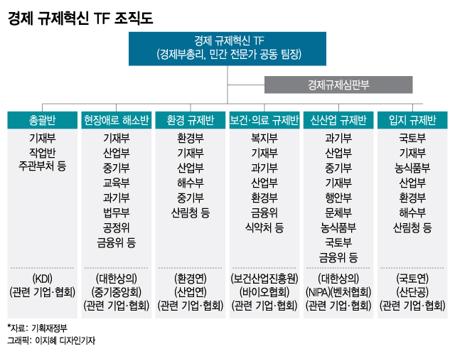 정부는 강력한 규제개혁 드라이브를 위해 이달 중 민관합동 경제 규제혁신 TF(태스크포스)를 발족할 계획이다. 경제 분야 규제개혁의 총괄·조정을 위한 협의체인 TF는 추경호 부총리 겸 기획재정부 장관과 민간 전문가가 공동 팀장을 맡아 이끈다. TF 내에는 △총괄반 △현장애로 해소반 △환경규제반 △보건·의료 규제반 △신산업 규제반 △입지 규제반이 설치돼 각 분야의 규제를 발굴하고 개선을 추진한다.