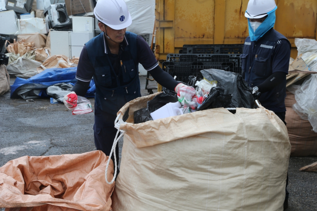 지난달 27일 광양항 관리부두에서 만난 유창청소업체 관계자에게 해양플라스틱 업사이클 현장의 애로사항을 묻자 한치 망설임 없이 '돈'을 지목했다. 이날은 원료부두에 철광석을 공급한 20만톤급 화물선 'SM라이언호'에서 내린 생활 폐기물의 분리 수거 작업이 한창이었다. 배에서 내린 톤백(물 1톤을 담을 수 있는 대형포대)을 열으니 화장지와 비닐, 깡통 등 구분없이 섞인 생활 쓰레기가 한가득이었다. 매번 같은 일을 반복하는 작업자조차 얼굴이 찌푸려질 정도로 한달 가량 항해에서 묵힌 악취가 마스크를 넘어 들어왔다.