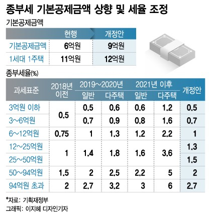 또 정부는 주택가격 상승을 반영해 종부세 기본공제금액을 기존 6억원에서 9억원으로 상향 조정했다. 기본공제금액이 상향된 것은 2005년 종부세 도입이후 처음이다. 1세대 1주택자에 적용되는 기본공제금액은 기존 11억원에서 양도소득세 고가주택 기준과 동일한 12억원으로 상향한다.