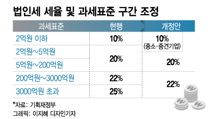 매출액이 3000억원 이하인 중소·중견기업에 대해서는 과세표준 5억원까지 10% 특례세율을 적용해 세부담을 완화한다. 이 밖에 과세표준 200억원 이하는 20%, 200억원 초과는 22%의 법인세율을 적용할 계획이다.