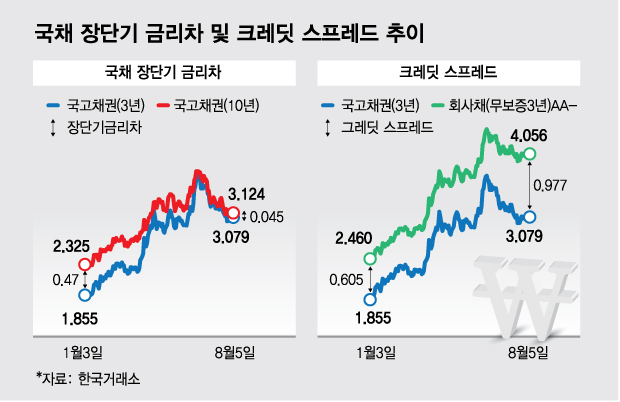 기업들의 어려운 자금 사정을 예고하듯 국채와 회사채간 금리차(크레딧 스프레드)도 벌어지고 있다. 시장에서 경기둔화에 따른 부도 위험 등을 우려해 회사채 투자를 줄이고 있기 때문이다.