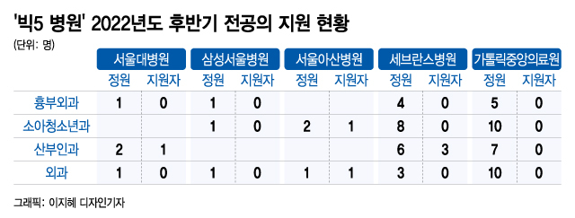 올해 후반기 전공의 지원 현황에서도 필수의료 기피 현상이 나타났다. 2022년 후반기 이른바 '빅(Big)5' 병원의 전공의 지원 현황을 보면, 산부인과는 모집 정원이 15명이지만 지원자는 4명에 불과했다. 소아청소년과는 빅5 병원에서 21명을 모집했지만, 서울아산병원에서 한 명밖에 지원하지 않았다. 흉부외과는 11명 정원에서 5개 병원을 다 합해도 지원자가 '0명'이었다.