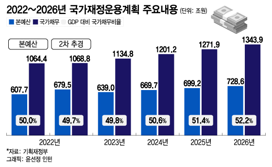 국가채무는 2026년에 1300조원을 넘어설 전망이다. 구체적으로 본예산 기준 △2022년 1064조4000억원(2차 추경 1068조8000억원) △2023년 1134조8000억원 △2024년 1201조2000억원 △2025년 1271조9000억원 △2026년 1343조9000억원으로 늘어나게 된다. GDP 대비 국가채무비율은 본예산 기준 올해 50%(2차 추경 49.7%)에서 △2023년 49.8% △2024년 50.6% △2025년 51.4% △2026년 52.2%로 높아질 전망이다.