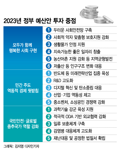 윤석열 정부는 출범 후 처음 편성한 예산안에서 지출 확대폭을 지난 정부보다 크게 낮춰 재정정책의 초점을 '건전화'에 맞췄음을 명확히 했다. 그러면서도 물가 상승과 경기 둔화에 따른 취약계층 어려움 가중을 고려해 '서민·사회적약자 지원 강화'에 가용 재원을 집중 투입하기로 했다.