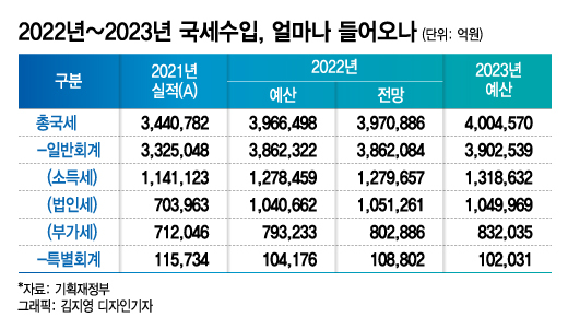 기획재정부가 30일 발표한 '2022~2023년 국세수입 전망'에 따르면 내년 국세 수입은 올해(397조886억원)보다 0.8% 늘어난 400조4570억원을 기록할 것으로 전망됐다. 국세수입이 400조원을 넘길 것으로 전망되는 것은 내년이 처음으로 사상 최대치다. 1998년 외환위기와 2008년 글로벌 금융위기와 유사한 경제위기가 오지 않는 한 국세수입은 늘어나는 것이 보통이다. 경제가 성장하고 물가가 오르기 때문이다.