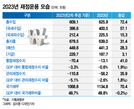 추경호 부총리 겸 기획재정부 장관은 지난 25일 정부세종청사에서 가진 사전브리핑에서 "내년 예산안은 건전 재정의 기틀을 확고히 확립해 나간다는 기조하에 편성했다"며 "내년 예산안은 예년 대비 크게 낮은 5.2% 증가(올해 본예산 607조7000억원 대비)에 그친 총 639조원"이라고 말했다. 이어 "추경을 포함하면 2010년 이후 처음으로 올해 총지출(1·2차 추경을 반영한 679조5000억원) 대비 감소한 모습"이라고 말했다.