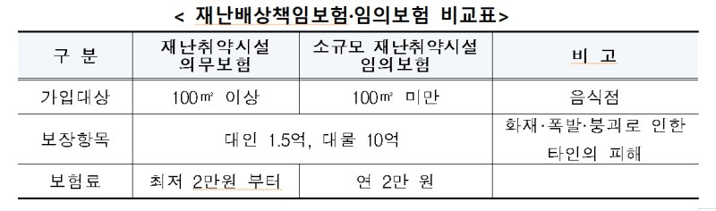 앞으로는 100㎡(30평) 미만의 소규모 음식점도 연간 2만원만 내면 화재나 붕괴, 폭발 등으로 인한 타인의 피해를 보장해주는 재난배상책임보험에 가입할 수 있다.