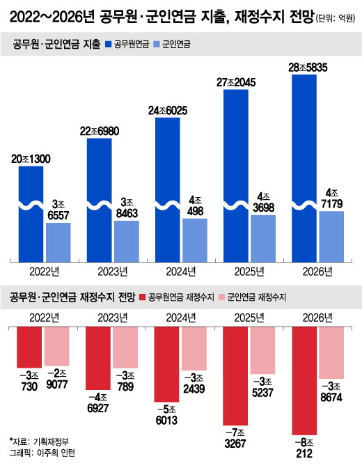 연금 불입 대비 지출 규모가 더욱 커지면서 공무원연금·군인연금 기금의 내년 적자 규모는 약 8조원에 달할 전망이다. 구체적으로 내년도 공무원연금 기금 재정수지 적자는 4조6927억원으로 올해 -3조730억원 대비 53%(1조6197억원) 늘어날 것으로 예상됐다. 이후 △2024년 -5조6013억원 △2025년 -7조3267억원 △2026년 -8조212억원 등으로 적자 폭을 늘려나갈 전망이다.