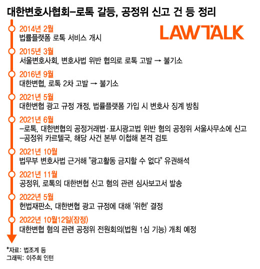 이번 사건은 로톡을 운영하는 로앤컴퍼니가 지난해 6월 변협의 '변호사 광고에 관한 규정' 등이 위법하다며 공정위에 신고하면서 시작됐다. 앞서 변협은 변호사 광고에 관한 규정과 변호사 윤리 장전을 개정, 소속 변호사들이 로톡 등 법률 플랫폼을 이용할 경우 징계할 수 있도록 했다. 이에 로앤컴퍼니는 "사업자단체가 구성원의 광고 활동을 부당하게 제한, '표시 광고의 공정화에 관한 법률(표시·광고법)'와 '공정거래법'을 위반했다"며 경쟁당국에 신고했다.