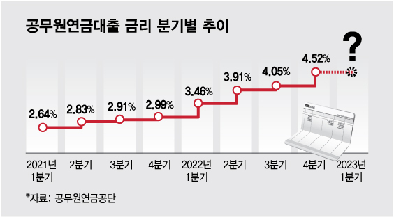 10일 공무원연금공단에 따르면 이달부터 올해 연말까지 적용되는 공무원연금대출 이자율은 4.52%로 종전 3분기 대출금리 4.05%보다 0.47%p 올랐다. 이번 주 기준금리가 0.5%p 오르면 내년 이자율은 5%를 훌쩍 넘을 것으로 보인다.