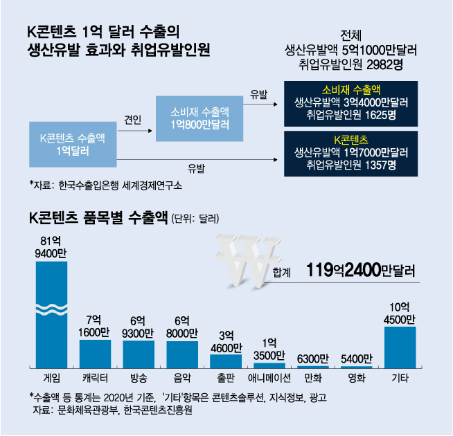 한국수출입은행이 지난 5월 발표한 이슈보고서 'K-콘텐츠 수출의 경제효과'에 따르면 K-콘텐츠 수출 1억달러당 소비재 수출을 포함한 생산유발효과는 5억1000만달러(약7200억원)가 발생하는 것으로 추산된다. 또 K-콘텐츠 수출액이 1억달러 늘어난 경우 소비재 생산이나 K-콘텐츠 생산 등을 포함해 총 2982명의 취업유발 효과가 있는 것으로 추정됐다.