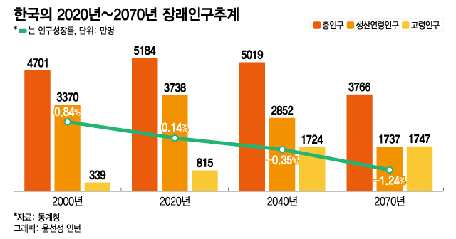 통계청이 지난해 말 발표한 '장래인구추계:2020~2070년' 따르면 우리나라 총인구는 지난 2020년 5184만명으로 정점을 찍고 2년째 내리막길을 걷고 있다. 총인구는 향후 약 50년 동안 급격히 감소해 2070년 3766만명까지 떨어질 전망이다. 15~64세 생산연령인구는 지난 2016년 3762만1000명으로 정점을 찍고 6년째 감소 중이며 2070년에는 1737만명까지 쪼그라들 것으로 보인다. 이 추세대로면 2700년쯤 우리나라는 마지막 국민이 사명하면서 아예 소멸하게 된다.