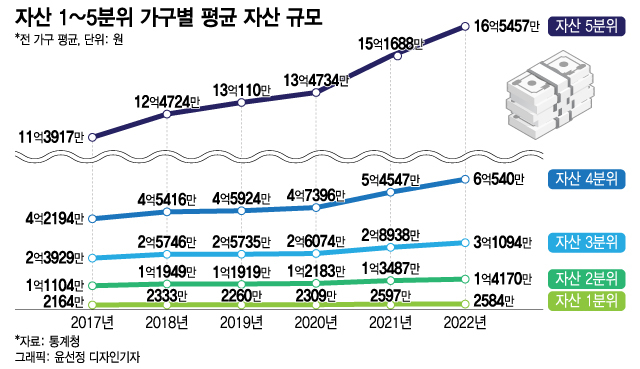 이로써 자산 5분위의 평균 자산은 1분위 평균 자산의 64배에 달했다. 이러한 5분위와 1분위의 자산 격차는 관련 통계가 작성된 2012년 이후 최대로 벌어졌다.