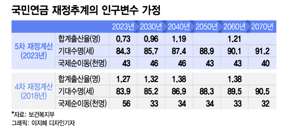 국민연금 소진시점이 앞당겨질 것이라는 건 예상 가능한 시나리오였다. 국민연금 재정추계에서 가장 중요한 변수 중 하나는 인구다. 합계출산율과 기대여명 등 인구변수에 따라 국민연금을 '내는 사람'과 '받는 사람'의 규모가 어느 정도 추산되기 때문이다. 기록적인 초저출산 현상으로 '내는 사람'이 줄어드는 상황에서 고갈시계는 빨라질 수밖에 없다.