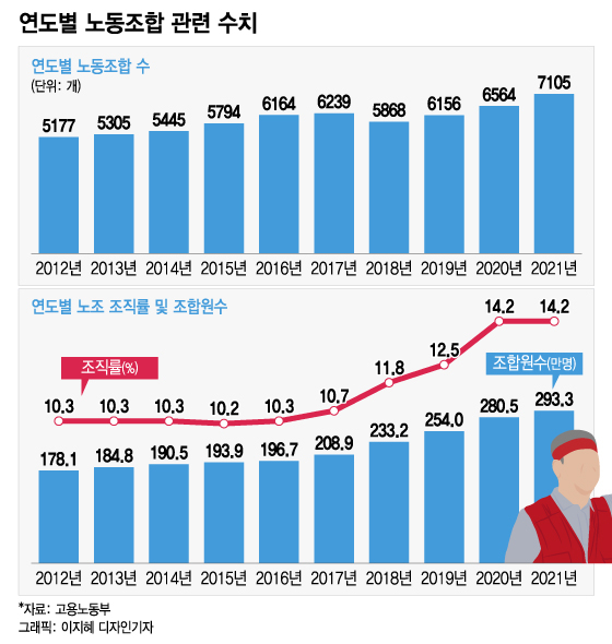 지난 2021년 기준 노조수는 7105개로 조합원은 293만3000명이다. 고용부는 이 수치에 상당한 '허수'가 있을 것으로 보고있다.