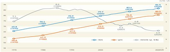 기대수명은 특정 연도에 태어난 사람이 향후 생존할 것으로 기대되는 평균수명을 의미한다. 2020년 기준 여자와 남자의 기대수명은 각각 86.5세, 80.5세로 격차가 6년에 달한다.
