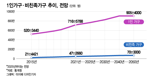 2021년 기준으로 비친족가구는 47만2660가구다. 앞으로는 △2025년 53만2000가구 △2030년 59만8000가구 △2040년 68만1000가구 △2050년 70만3000가구 등으로 전망된다.