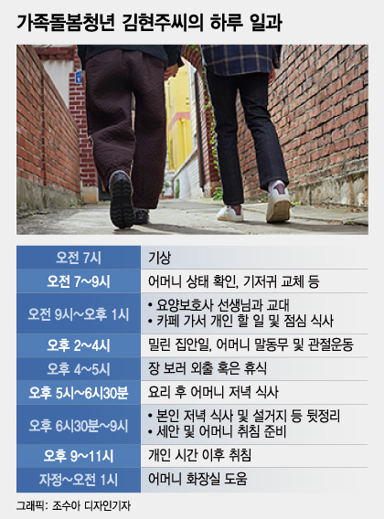 2021년 대구의 20대 청년이 홀로 뇌출혈로 쓰러진 아버지를 돌보다 돌봄을 포기해 죽음에 이르게 한 '대구 청년 간병인 비극' 사건 이후 김씨와 같은 '영 케어러(가족돌봄청년·청소년)'에 대한 사회적 관심은 급증했다. 올해 정부와 서울시 등은 관련 실태조사를 발표했지만, 김씨의 삶은 크게 달라진 바가 없다고 한다. 그는 "영 케어러가 처한 상황이 제각각이니 종합적인 시스템이 마련돼야 하는데, 그러기엔 여전히 사회적 인식이 부족한 것 같다"며 "지원이 늦어질수록 돌봄에서 오는 부담은 늘어나기 때문에 지원이 시급한 상황"이라고 강조했다.