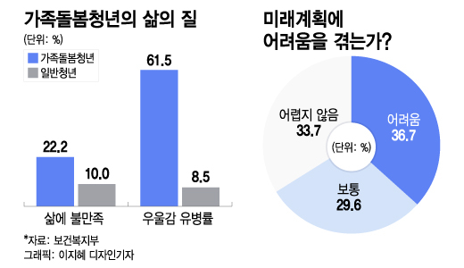 사정이 이렇다 보니 영 케어러들은 일반 청년보다 삶의 만족도가 낮고, 우울감이 높으며, 미래 계획을 세우는 데 어려움을 겪고 있다. 서울시 조사에서 영 케어러가 삶에 불만족(32.5%)한다는 응답은 만족한다(28.2%)보다 4% 포인트 높은 것으로 나타났다. 복지부 조사에서 영 케어러가 삶에 불만족한다는 응답은 22.2%로 일반청년(10%)의 2배 이상이었다.