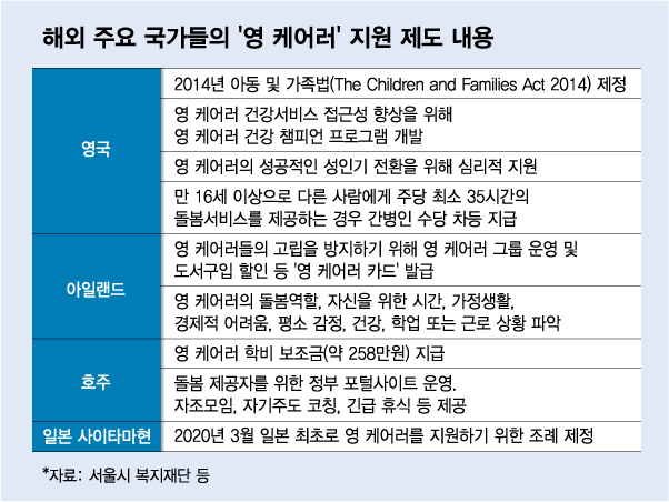 가족 부양 부담을 떠안은 '영 케어러(가족돌봄청년·청소년)'는 한국만의 문제가 아니다. 영국과 호주, 일본 등의 국가는 영 케어러가 또래 집단과 같은 일상적인 삶을 살 수 있도록 다양한 지원을 하고 있다. 가족을 돌보는 청년들을 사회 안전망의 한 축으로 인정하고 이들이 부양 부담 때문에 빈곤층으로 떨어지지 않도록 하는데 초점이 맞춰져있다.