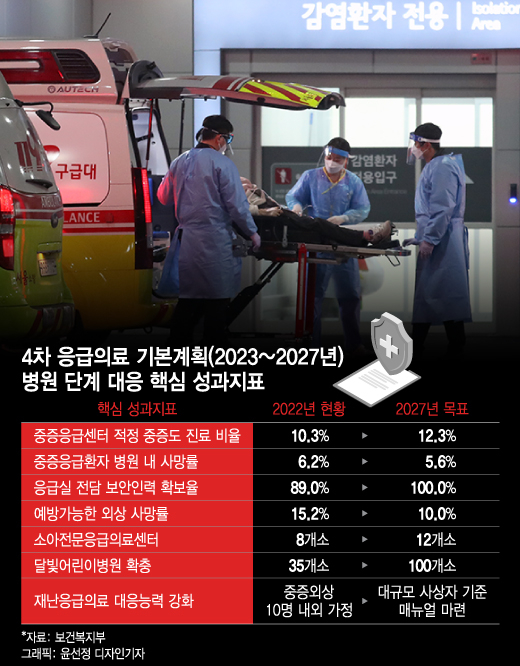 하지만 정작 응급환자당 주요 응급질환 전문의 수 등 관련 지표는 지금까지 기본계획 핵심 성과지표로 사용된 적이 없다. 올해 마련된 4차 기본계획의 '병원 단계 전문 분야별 대응' 영역에도△중증응급센터 적정 중증도 진료 비율△중증응급환자 병원 내 사망률△응급실 전담 보안인력 확보율△예방가능한 외상 사망률 정도만 핵심 성과지표로서 5년 뒤 목표치가 제시됐을 뿐이다. 생명을 다루는 필수의료 전문의 수를 지표화 하는 것은 현재 정부와 의료계 협의가 진행 중인 의대 정원 확대 및 필수의료 강화 방안과 맞물리기 때문이라는 지적이 나온다. 결국 '응급실 뺑뺑이' 문제의 근원적 해소 역시 의료계와의 협의가 필수인 셈이다.