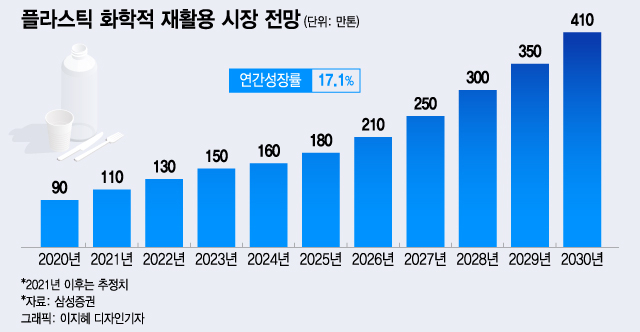 20일 삼성증권에 따르면 2020년 글로벌 화학적 재활용 시장규모는 생산량(수요) 기준 90만톤(t). 전체 플라스틱 재활용 시장에서의 비중은 6.6%에 불과하다. 하지만 10년 후인 2030년 화학적 재활용 시장은 410만톤으로 추산된다. 연간 17.1%의 성장률을 보일 전망이다. 기계적 재활용 시장이 2.8%씩 커지는 것과 비교하면 6배 이상 성장속도가 빠르다는 얘기다.