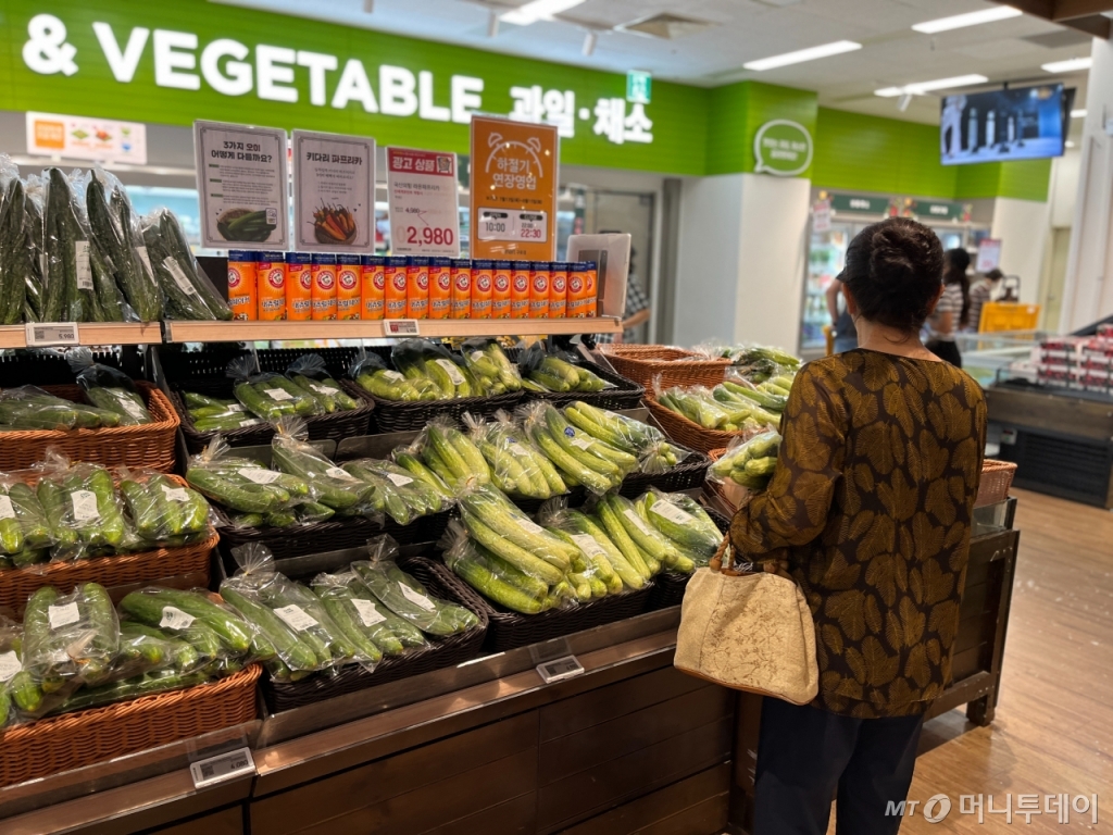 금천구에 사는 B씨는 백다다기 오이 앞에서 스마트폰을 들고 가격비교에 열을 올렸다. 이날 백다다기 오이는 3개에 4280원에 판매되고 있었다. 지난달 16일 전국 대형마트 평균가격보다 79% 오른 가격이다.