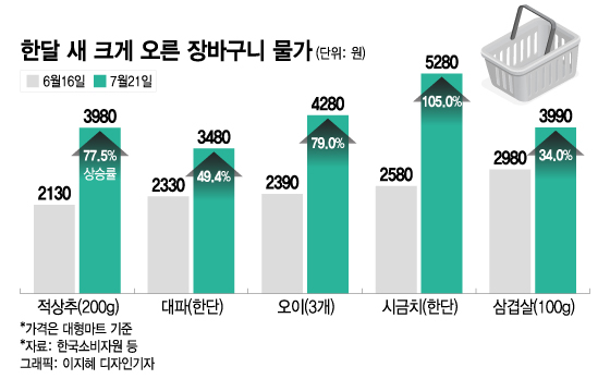 장바구니 물가가 이렇게 오른 것은 최근 이어진 집중호우의 영향이다. 농림축산식품부에 따르면 지난 10일부터 시작된 비로 23일 오전 6시까지 전북·충남·충북·경북 등에서 농지 3만5393헥타르(ha)가 침수됐다. 이는 여의도 면적의 약 122배에 달하는 면적이다. 또 가축 87만1000마리, 축사·비닐하우스 등 시설 59.9ha의 피해를 입었다.