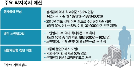 기초연금 지급 인원도 665만명에서 700만6000명으로 확대하고 지급액을 월 32만3000원에서 33만4000원으로 올린다. 거동이 불편한 독거노인 5만7000명을 위한 돌봄서비스도 월 16시간에서 20시간으로 확대한다.