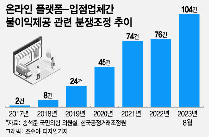 이 가운데 온라인 플랫폼 사업자가 입점업체에 내린 불이익 조치에 대한 분쟁이 큰 비중을 차지한다. 실제 2017년 2건에서 2023년 8월 말 현재 104건으로 5년 새 52배 증가했다.