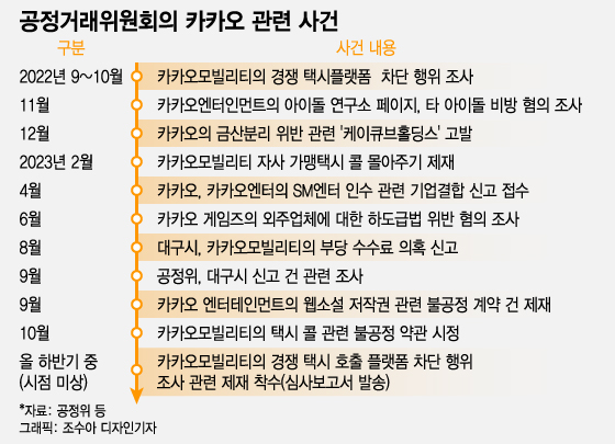 이 밖에도 공정위는 카카오 그룹을 대상으로 불공정거래 행위 조사 및 제재를 해왔다. 올해 들어서만 △카카오 모빌리티의 자사 가맹택시(카카오T 블루)에 콜 몰아주기(2월) △카카오 엔터테인먼트의 웹소설 저작권 관련 불공정 계약(9월) △카카오모빌리티의 택시 호출 관련 불공정 약관 시정(10월) 등 건이 마무리됐다.