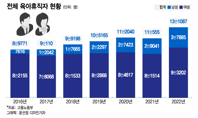 통계청이 지난해 말 발표한 '육아휴직 통계 결과'를 보면, 2021년 기준 출생아 100명당 출생아 부모 중 남성 육아휴직자는 3.0명으로 여성(26.3명)과 큰 차이를 보인다. 남성이 육아휴직을 가는 것에 대한 기업들의 불편한 시선과 육아휴직 급여의 상한선 설정에 따르면 경제적 부담 등이 작용한 결과다. 정부는 일·가정 양립에 적극적인 기업에 혜택을 주는 방안도 검토하고 있다.