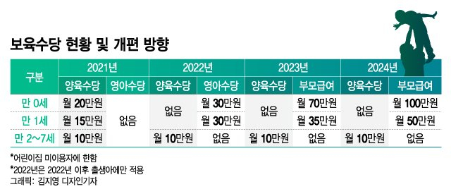 이 과정에서 형평성 논란도 불거졌다. 어린이집의 보육료가 가정양육수당보다 훨씬 많았기 때문이다. 이에 따라 2022년에 영아수당이 도입됐다. 만 0~1세에게는 가정양육수당 대신 매달 30만원의 영아수당을 지급했다. 어린이집을 다니지 않는 만 2세부터 84개월 미만의 아동에겐 월 10만원의 가정양육수당을 그대로 줬다.