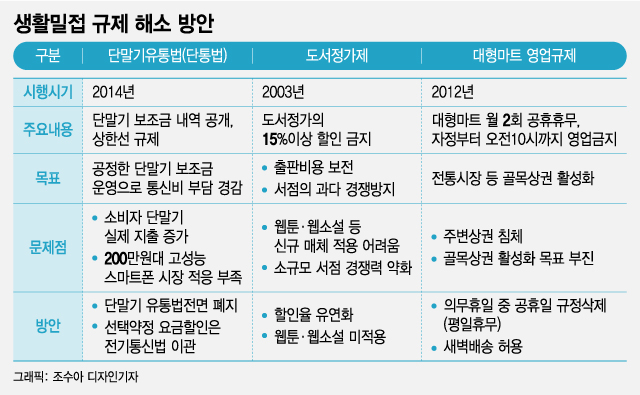 정부가 휴대전화 단말기 보조금 상한액을 규정한 '단말기유통법'(단통법)을 전면 폐지한다. 2014년 시행된 단통법은 이동통신사의 단말기 보조금을 투명하고 공정하게 나눈다는 취지와 달리 소비자의 단말기 구매비용 상승으로 이어졌다는 비판을 받고 있다. 정부는 단통법을 비롯해 도서정가제와 대형마트 영업규제 등 국민 생활에 밀접한 민생규제 3건을 개혁, 국민 체감도를 높일 방침이다.