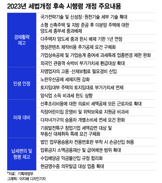 기획재정부는 23일 이런 내용의 '2023년 세법개정 후속 시행령 개정안'을 25일부터 입법예고한다고 밝혔다. 지난해 국회를 통과한 개정 세법 및 올해 경제정책방향 등에서 공개한 주요 과제의 세부 내용을 규정하기 위한 것이다.