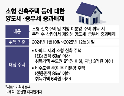 우선 신규 취득한 소형 신축 주택 등에 대한 세 부담을 완화한다. 원래 양도세는 2주택부터, 종부세는 3주택부터 중과 세율이 적용되는데 내년 말까지 취득한 특정 주택은 '주택 수'에서 제외해 다주택자 중과를 하지 않는다.