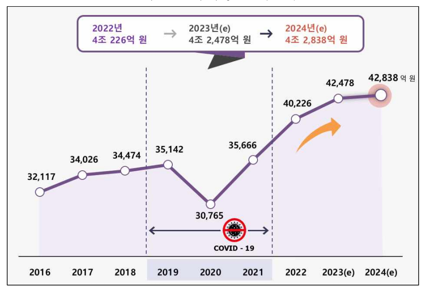 한국지방재정공제회(LOFA)가 29일 옥외광고산업의 시장규모와 행정실태를 수록한 '2023 옥외광고통계'에 따르면 2022년 옥외광고산업 매출액은 전년(3조5666억원) 대비 12.8% 성장한 4조226억원을 기록했다. 향후 추정치도 2023년 4조2478억원, 올해 4조2838억원으로 증가세를 보일 전망이다.