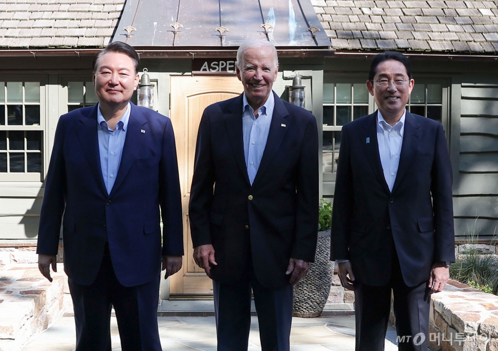![[캠프 데이비드=뉴시스] 전신 기자 = 윤석열 대통령이 18일(현지시간) 메릴랜드주에 위치한 미국 대통령 별장 캠프 데이비드에서 한미일 정상회의 일정을 마친 뒤 조 바이든 미국 대통령, 기시다 후미오 일본 총리와 기념촬영하고 있다. (공동취재) 2023.08.19. photo1006@newsis.com /사진=전신](https://thumb.mt.co.kr/cdn-cgi/image/f=avif/21/2024/03/2024030815304192086_1.jpg)