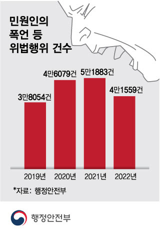 민원인의 폭언 등 위법행위는 더 이상 방치하기 힘든 수준으로 △2019년 3만8054건 △2020년 4만6079건 △2021년 5만1883건 △2022년 4만1559건에 달한다. 상황이 이렇다 보니 과도한 업무에 시달리는 민원업무는 이미 공직사회 내부에선 기피부서로 자리 잡으면서 이 자리에 경험이 부족한 젊은 공무원들이 배치되는 분위기다. 실제로 최근 경남 양산시청과 충북 괴산군청, 경기 김포·남양주·양주시청에서 숨진 5명의 공무원은 입사한 지 3개월에서 3년차에 불과했다.
