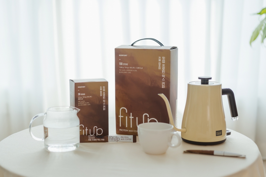 우선 컴포어는 단백질 섭취가 부족한 어르신들을 위해 '핏업 프로틴 믹스커피'를 선보인다. 컴포어의 '핏업 프로틴 믹스커피'는 잦은 믹스커피 섭취로 건강을 해치는 어르신을 위해 고안된 제품이다. 우리가 흔히 알고 있는 믹스커피에서 설탕을 덜어내고 단백질을 추가했다.