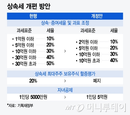 정정훈 기재부 세제실장은 "상속세 과표 조정으로 5000억원, 최고세율 인하로 1조8000억원, 공제액 조정으로 1조7000억원의 세수가 줄어들 것으로 예상한다"고 설명했다.