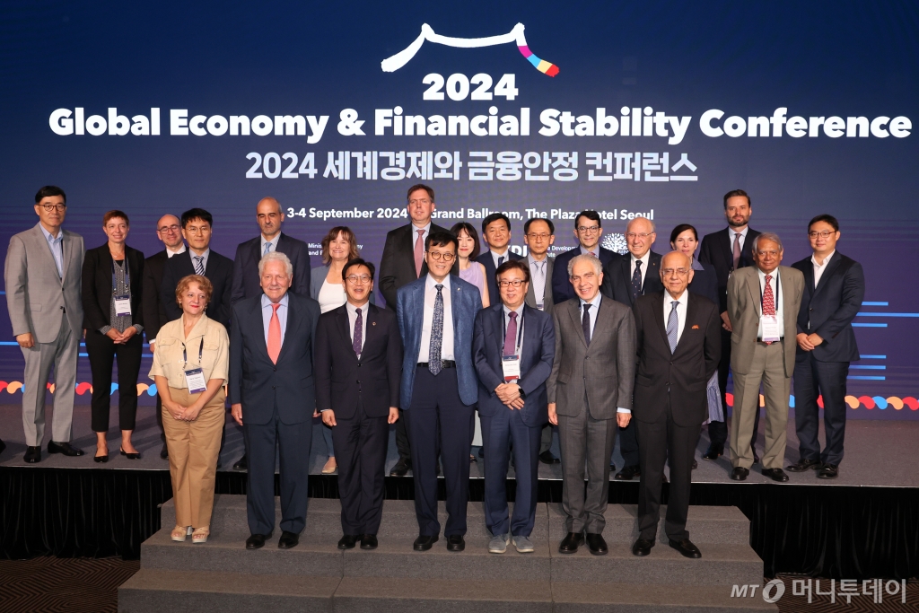 ![[서울=뉴시스] 배훈식 기자 = 김범석(앞줄 왼쪽 세번째) 기획재정부 1차관, 이창용 한국은행 총재, 조동철 한국개발연구원장 등이 3일 오후 서울 중구 플라자호텔 서울에서 열린 2024 세계경제와 금융안정 컨퍼런스에서 기념촬영을 하고 있다. 2024.09.03. dahora83@newsis.com /사진=배훈식](https://thumb.mt.co.kr/cdn-cgi/image/f=avif/21/2024/09/2024090313440112638_1.jpg)