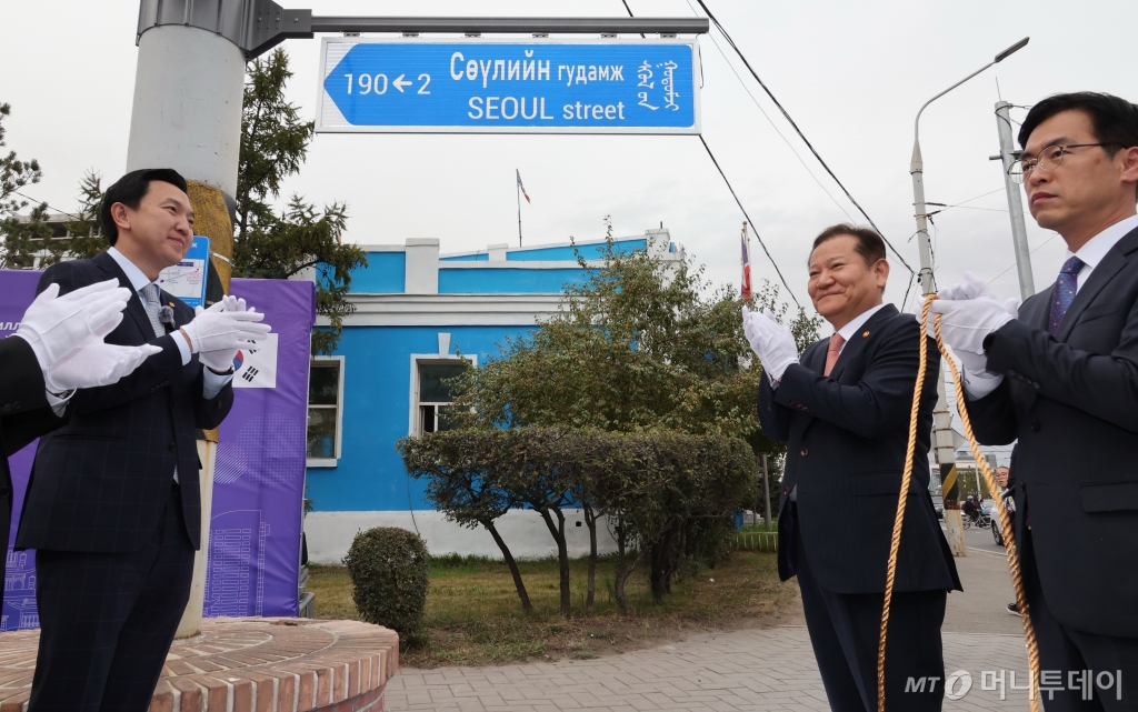 ![[서울=뉴시스] 고범준 기자 = 이상민(오른쪽 두번째) 행정안전부 장관과 냠오소르 오츠랄 몽골 내각관방부장관이 23일(현지시간) 몽골 울란바토르 시내 중심가에 위치한 서울의 거리 도로명판 제막식에서 양국 참석자들과 도로명판 제막하고 박수치고 있다. (사진=행정안전부 제공) 2024.09.23. photo@newsis.com *재판매 및 DB 금지 /사진=](https://thumb.mt.co.kr/cdn-cgi/image/f=avif/21/2024/09/2024092416023289671_1.jpg)