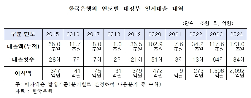 지난 한해 정부의 한은 일시차입 규모는 역대 최대를 기록했던 2023년 연간 차입규모(117조6000억원)을 뛰어넘는 수준이다. 차입 횟수 역시 2023년(64회)보다 20차례 더 많았다.