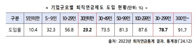 가입사업장은 42만9000여개로 도입률은 26.4%수준이다. 2005년 도입 이후 20년이 지났으나 사업장 도입률은 26-27%에서 벗어나지 못하고 있다. 특히 30인 미만 사업장 도입률은 23.7%로 300인 이상 사업장도입률 91.9%의 1/4수준이다.